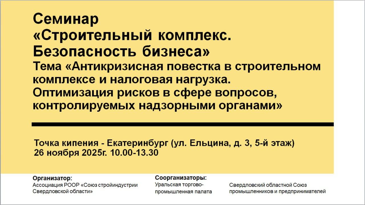 Ассоциация СРО «Союз стройиндустрии Свердловской области» РООР проводит Семинар «Строительный комплекс. Безопасность бизнеса» по теме «Антикризисная повестка в строительном комплексе и налоговая нагрузка. Оптимизация рисков в сфере вопросов, контролируемых надзорными органами».